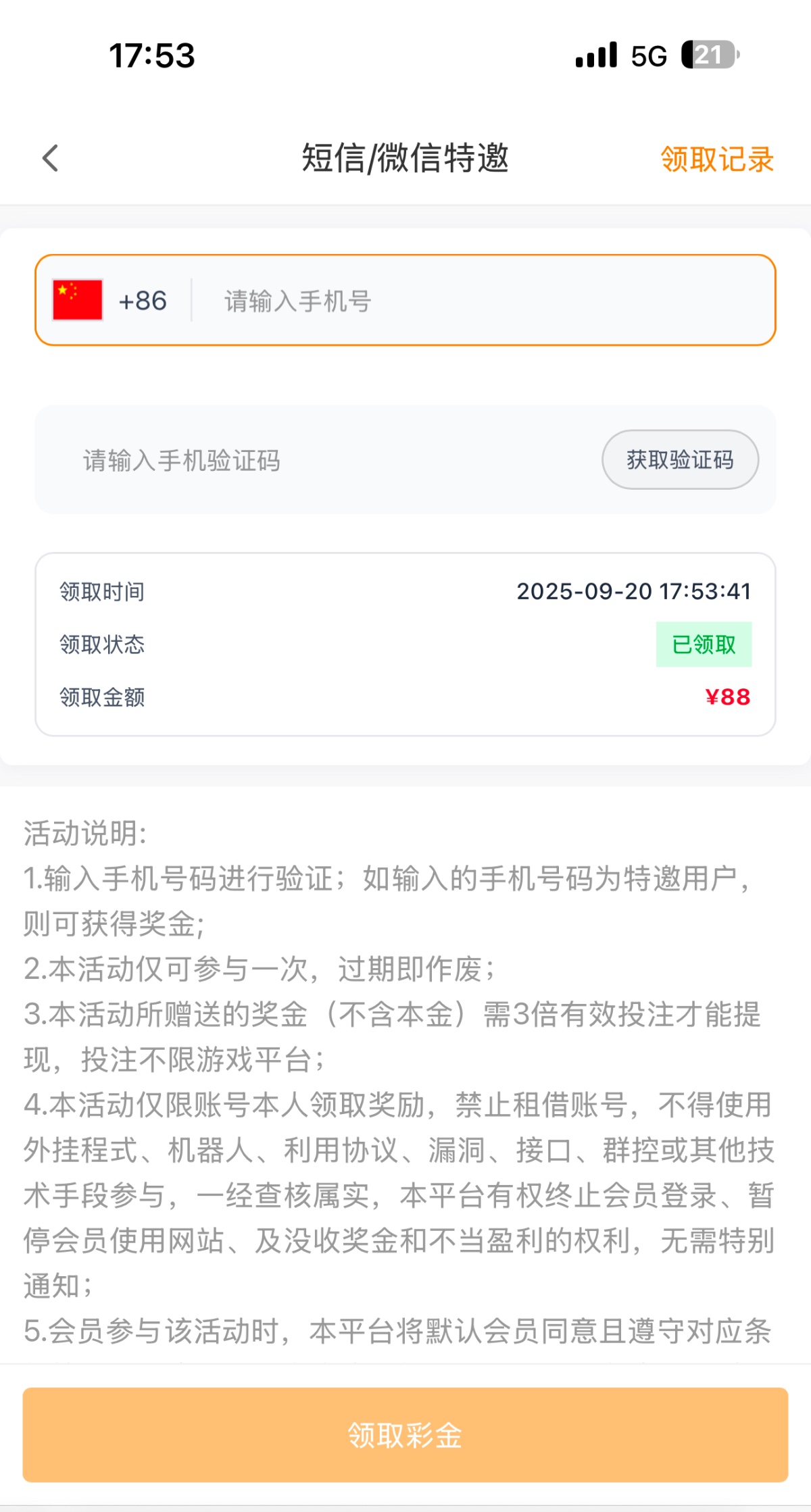 自己在优惠里面找下自助申请优惠的地方填上手机号码