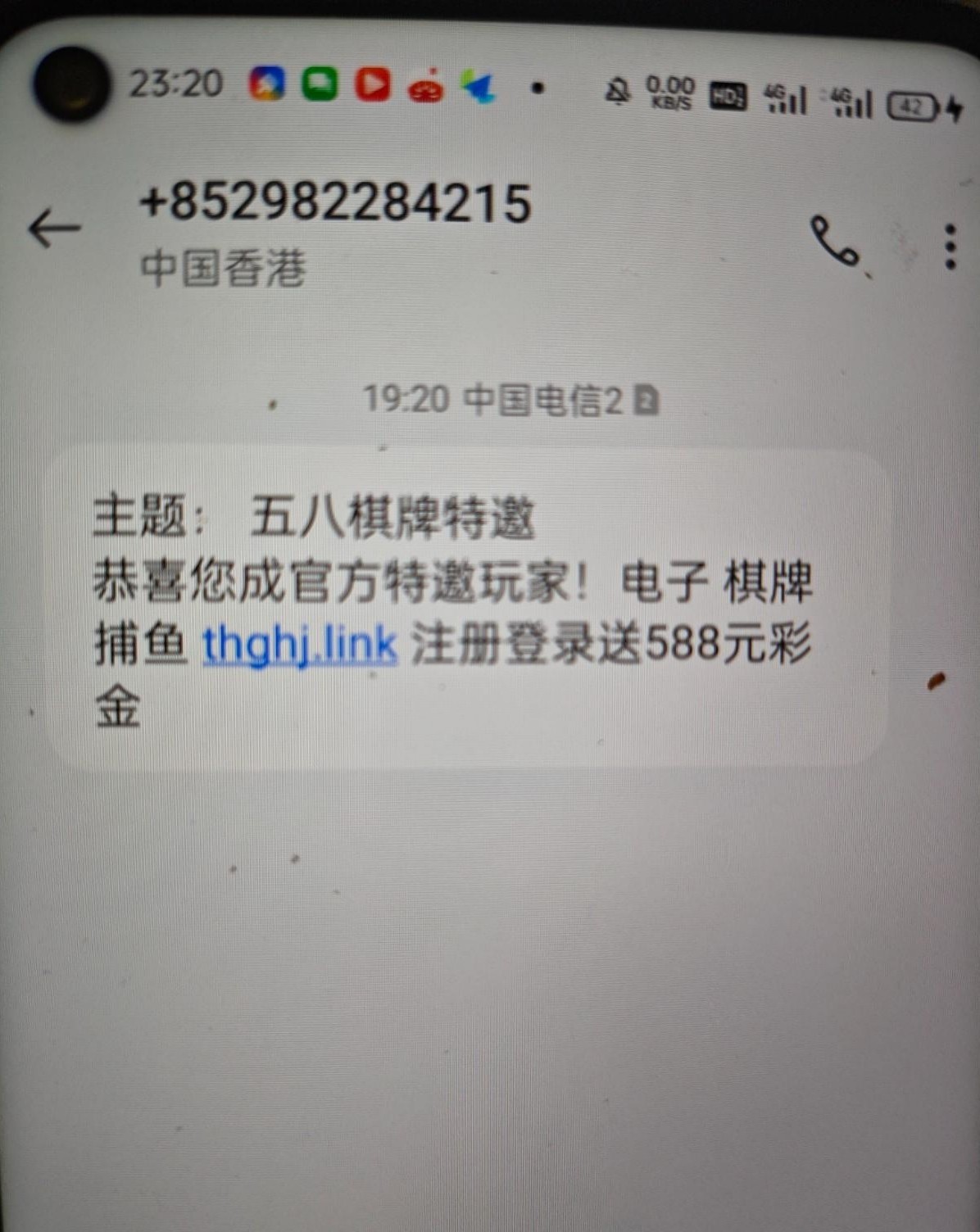 注册找客服领取短信特邀彩金,给了58,短信图在下面,老哥们可以自己做一个或者直接用,只能打棋牌捕鱼,不能打红黑这些,我没看清打红黑,后面退回,打完了,祝老哥们都能打出来网址 thghj.link
