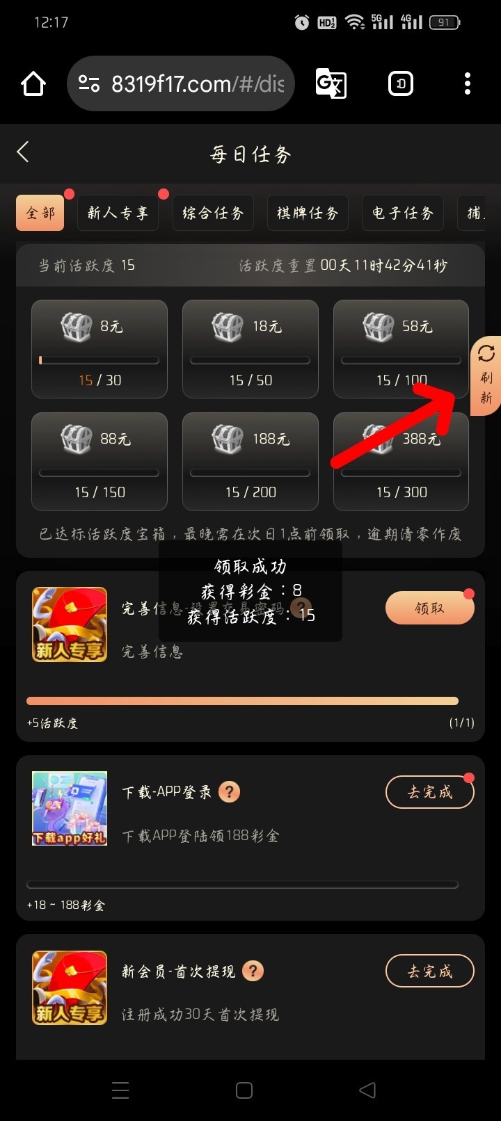 每日任务里面完善信息送8这种台一般出款半黑,总有人不会刷新,点一下就能刷新了看我标记