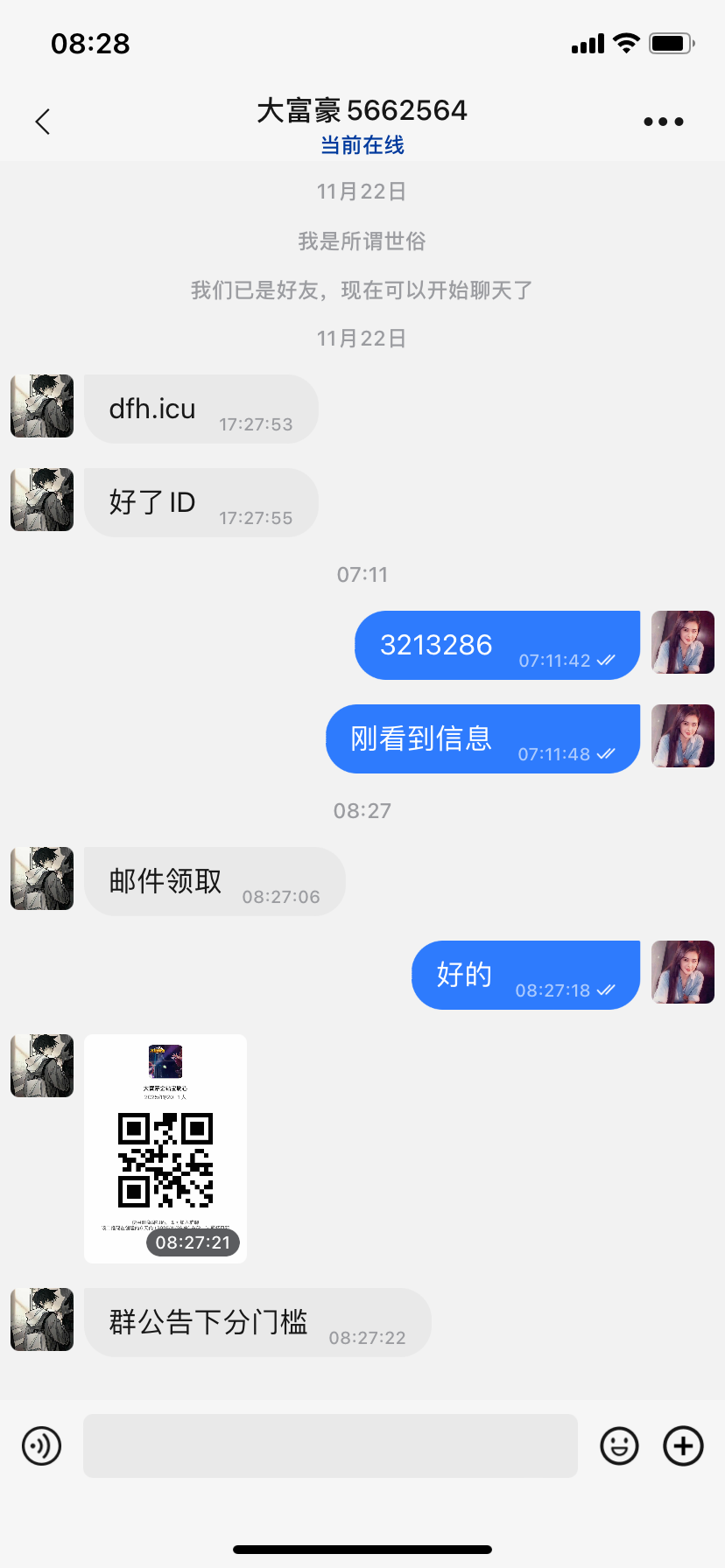 旺旺加5662564, 前天加他的,我没说话,他自己发的网址,我今天才看见,送了15万金币,,流水跟限制我也没问,去找他要吧