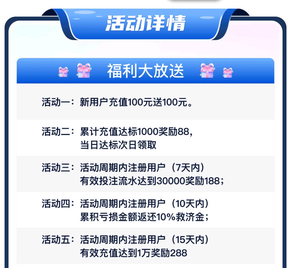 新玩家周期内充值满 1000 流水 3000 以上反588元, 只有注册的对应周期存款才有,必须充值3天以上,要官方平台过审的,可查验,多充多娱乐更容易达标,返现活动达标拿588元,官方没过审的补偿彩金88元,为了避免多iP不要开加速器。