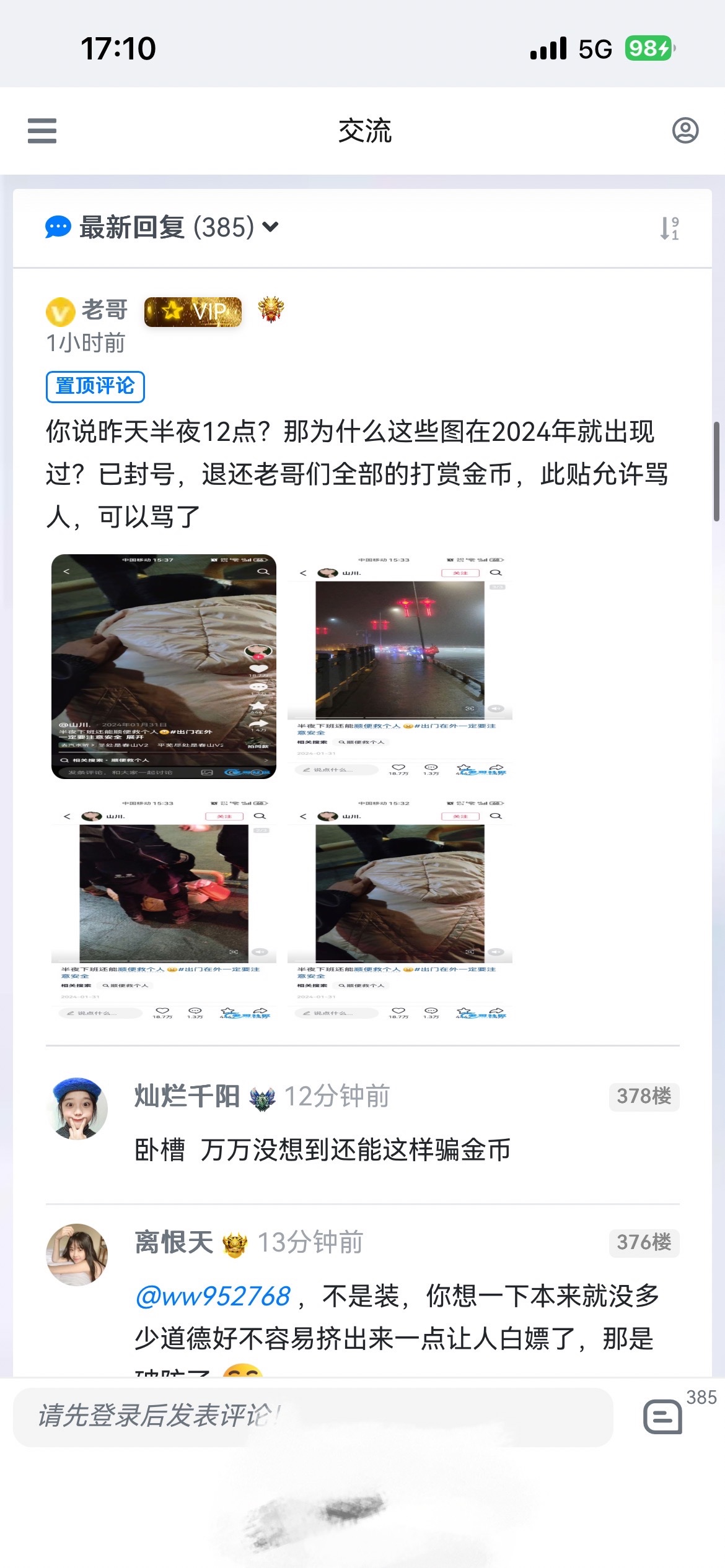 事情是这样的,今天无聊看到老哥的帖子,说自己救人了,还有好多人打赏金币, 老夫掐指一算,感觉不对,,我一看竟然是前年的事,什么事都没逃过我的法眼, ,希望老哥们眼睛放宽点,不要被骗了