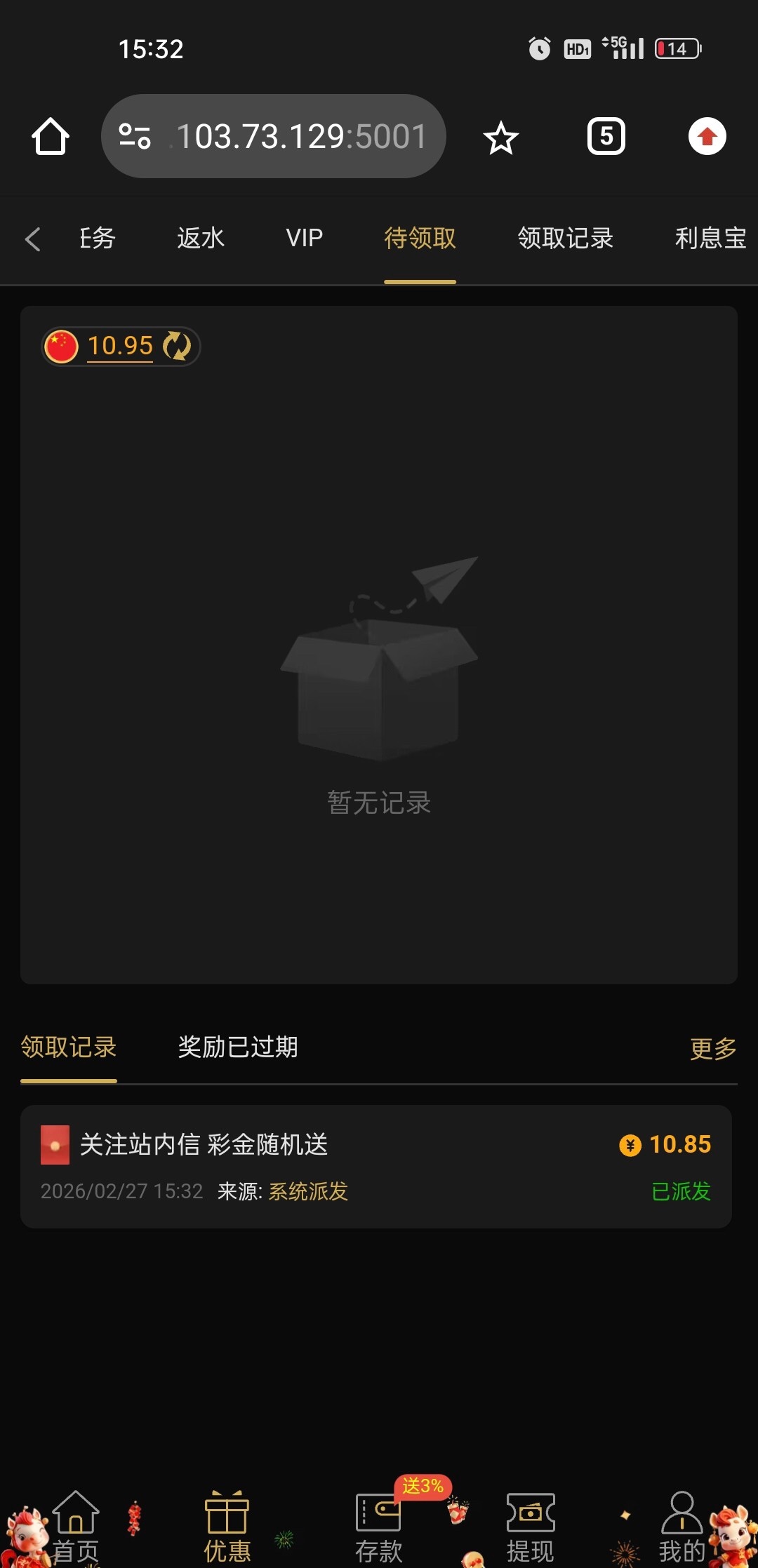接到电话上线领取彩金。去年充过50。有号的可以去看看。536.vip